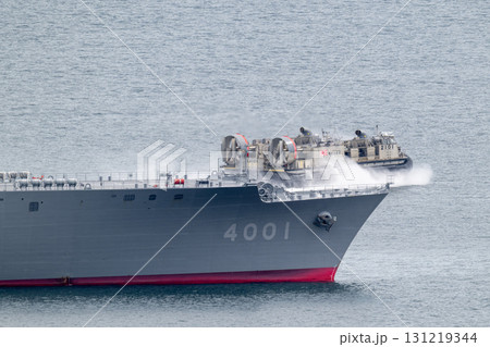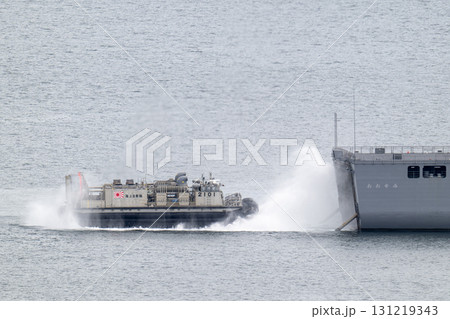 呉湾内の海上自衛隊の輸送艦おおすみと疾走するLCAC