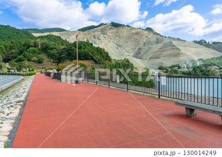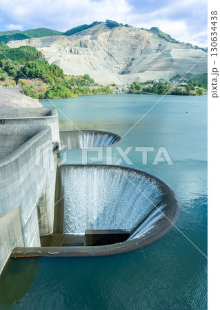 滋賀県甲賀市 二つの洪水吐きのある青土ダムを眺める散策路