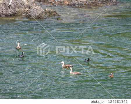 岩の上でくつろぐカモ マガモ オオバン