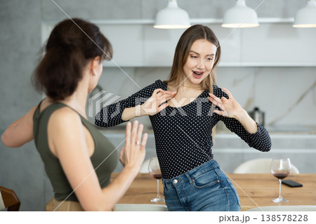 At home two women dance with glass of wine in their hands in kitchen