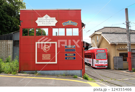 岡山市の東山おかでんチャギントミュージアム駅の車庫に停車する路面電車
