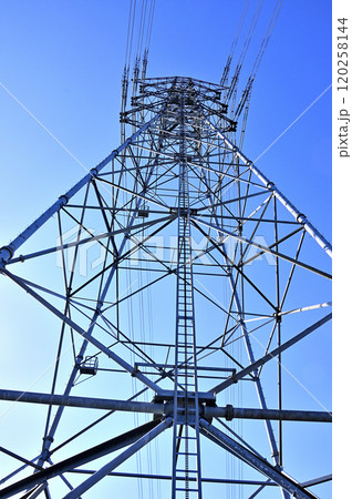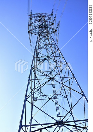 道志山塊の奥ノ岳にある送電鉄塔の展望台から富士山と青空のコピースペース