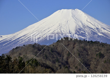 道志山塊の奥ノ岳にある送電鉄塔の展望台から雪景色の富士山