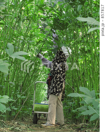夏野菜オクラの栽培 ハサミで収穫する男性 (7月) 家庭菜園