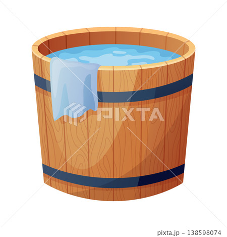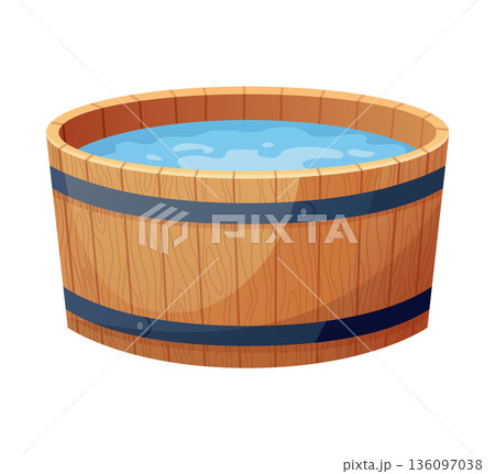 Wooden bath. Wood tub, cartoon rustic water bath barrel for public sauna traditional banya or onsen japanese hot spring, wellness relaxing bathtub basin neat vector illustration of tub bath wooden
