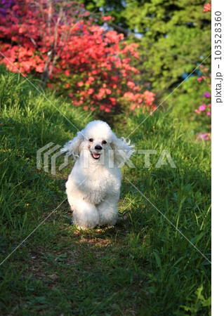 綺麗な赤いツツジが咲く遊歩道を笑顔で走って来る白いトイプードルのレオン君♡