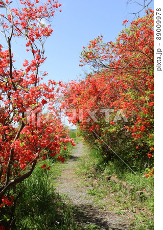 2021日本で一番幸せな町に選ばれた埼玉県鳩山町の赤いツツジと青空が彩るおしゃもじ山公園遊歩道の風景