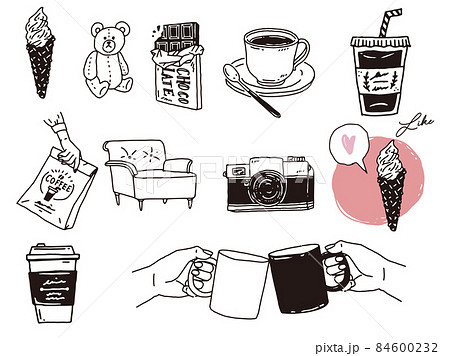 白黒、モノトーン、線画のイラスト(手書き、カメラ、カフェ、チョコ、インテリア、コーヒー、アイス)