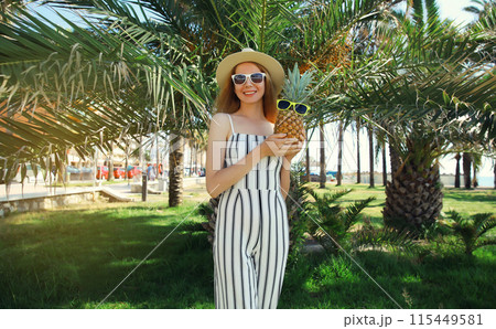 Summer fashion outfit of stylish happy smiling young woman holding pineapple in park with palm trees