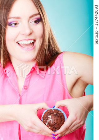 Summer portrait of happy young woman eating ice cream wearing sunglasses on red studio background