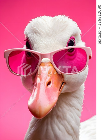 Funny white goose in pink sunglasses - summer fashion print design, isolated on colorful background