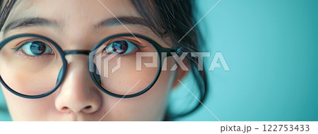 Close up portrait of young woman with glasses. Wide banner, copy space for text. Various projects. Beautiful girl wearing eyeglasses. Portrait of Asian lady in glasses satisfied ophthalmology service