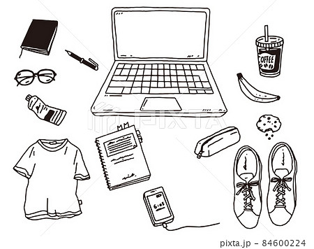 白黒、モノトーン、線画のイラスト(手書き、パソコン、勉強、仕事、コーヒー、洋服、スマホ)