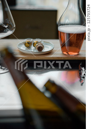 Decanter for sparkling wine on the table, Champagne tasting, Wine glasses, reflections, rose wine