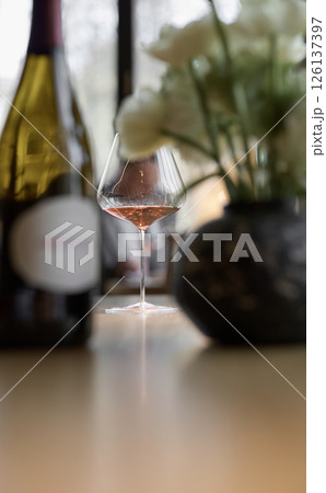 Bottle of rose champagne and wine glass is on table in the restaurant, flowers, wine cabinet, sparkling wine