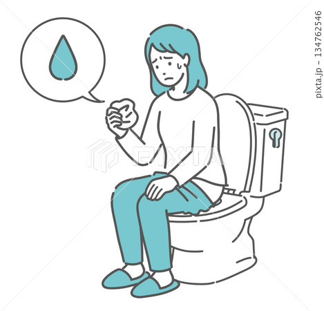 トイレで紙を見て経血やおりもの、尿漏れを確認する女性のイラスト(不正出血・雫アイコン)