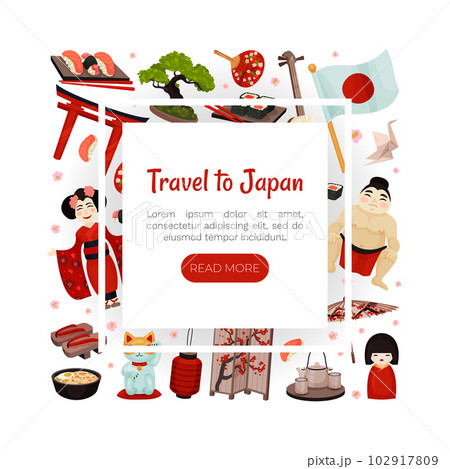 Japan Travel Banner Design with Traditional Symbols Vector Template