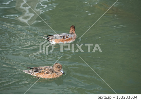 川岸でくつろぐヒドリガモ 京都市賀茂川