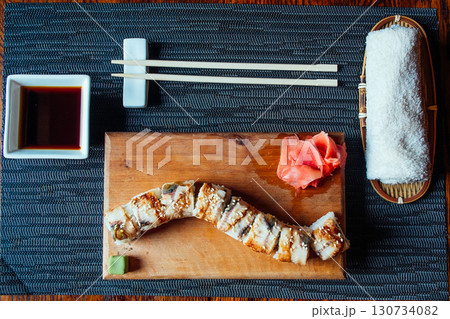 A sushi roll sits on a wooden board with chopsticks and sauce nearby