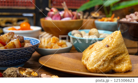 Artfully Crafted Golden Glutinous Rice Dumplings on a Clean Background