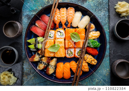 Assorted sushi platter with artistic nigiri and fresh seafood on black plate