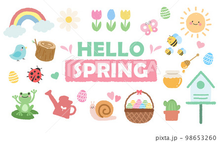 手繪蠟筆風格的春天元素,涵蓋了可愛的動物及植物的圖案