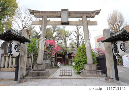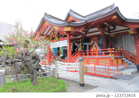 素盞雄神社(すさのおじんじゃ) 満開の桃の花と社殿