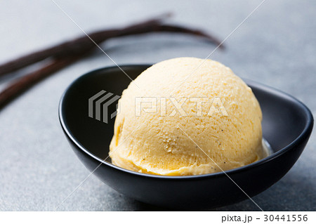 Vanilla, caramel ice cream in bowl, vanilla pods.