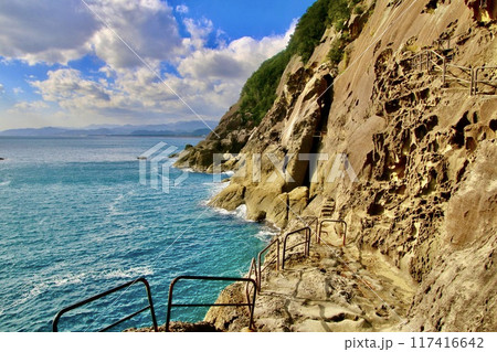 鬼ヶ城 遊歩道より望む岩肌と海岸