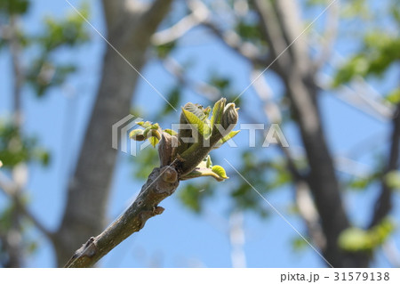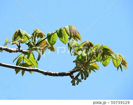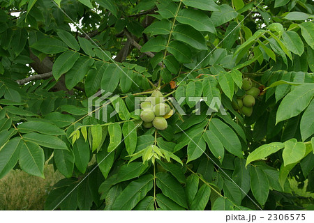 青葉と成長し始めの実の緑が鮮やかなオニグルミ