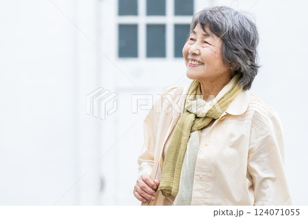 笑顔で元気に歩いている健康なシニア女性(全身)