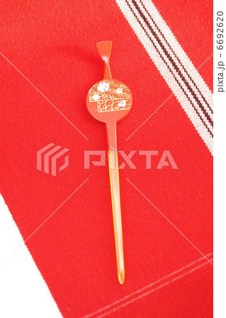 女の子のお祝いイメージ・可愛い笄全身・赤い帯バック縦位置