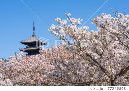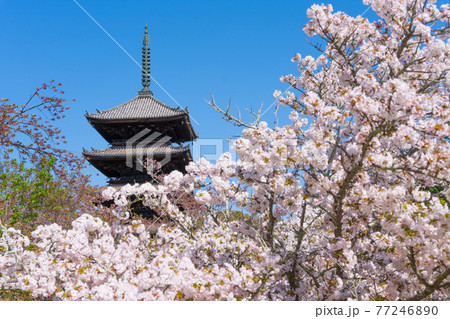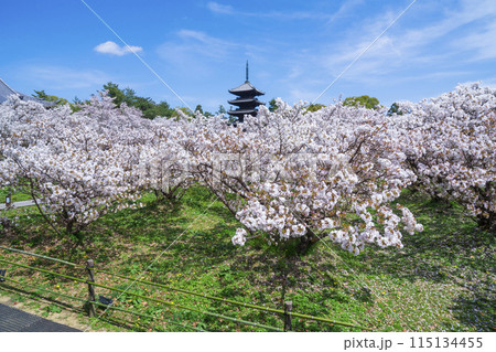京都市の世界遺産仁和寺の五重塔と御室桜