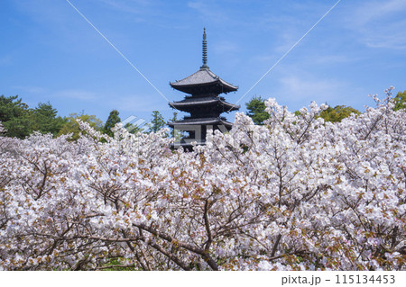 京都市の世界遺産仁和寺の五重塔と見事な御室桜