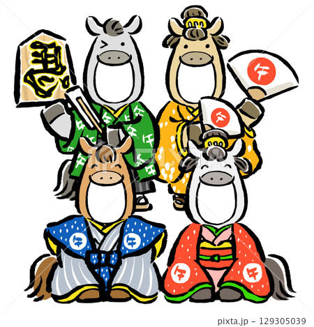 顔はめ年賀状素材4人用 午年の訪れを祝う干支の馬(午)たち