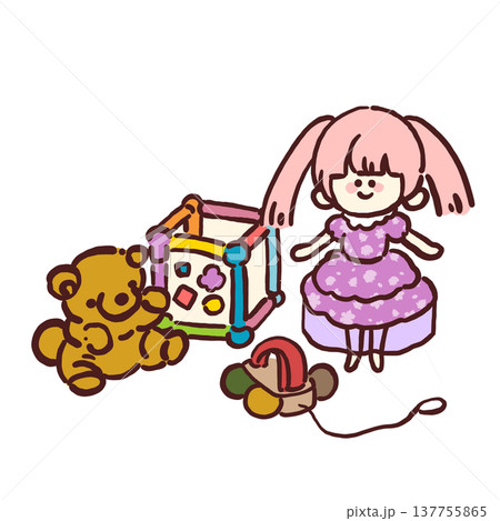 おもちゃのカラーイラスト(ぬいぐるみ・人形・知育玩具・木のおもちゃ)