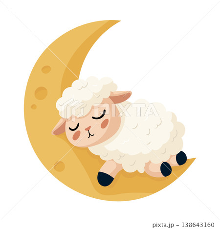 Cute Sleeping Sheep on Crescent Moon. Adorable nursery style lamb illustration in soft pastel colors. Flat vector clipart, illustration with isolated background.