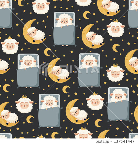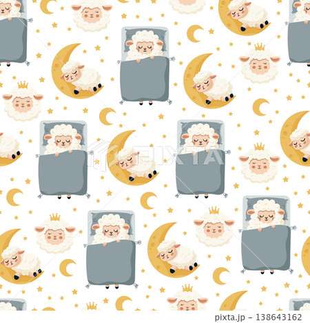 Seamless Cute Sleeping Sheep Nursery Pattern with Moon and Stars. Adorable lamb illustrations in soft pastel colors. Flat vector clipart, illustration with isolated background.