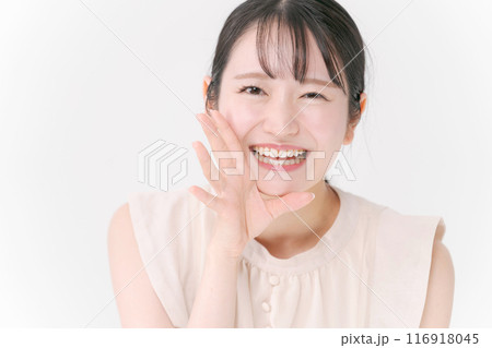 大声を出すジェスチャーの女性