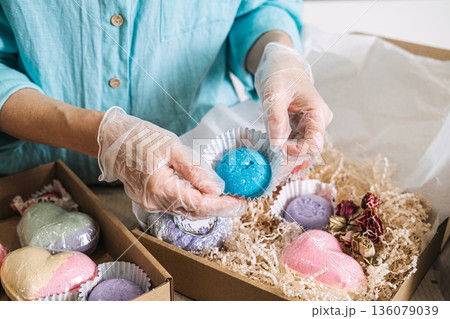 hands place blue bath bomb into cardboard gift box filled with shredded paper and various colorful cosmetic products. ceramide bath bomb, probiotic soak, lipid repair, skin longevity.