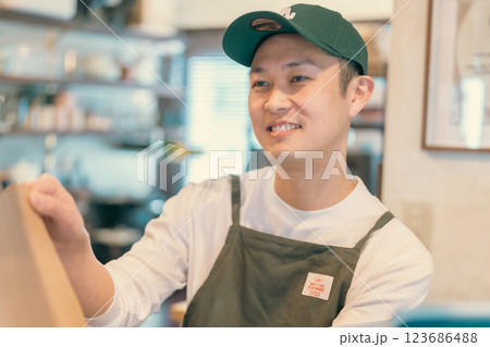商品をお渡しする笑顔の飲食店の店員 顔無し