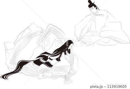 線画の「平安」王朝風の男女のイラスト。日本の民族衣装「直衣」の男性と「袿」の女性