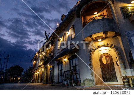 中世ヨーロッパ風のお店が立ち並ぶ外観の夕暮れ時