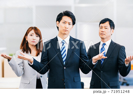 お手上げポーズをする眼鏡をかけたスーツの男性