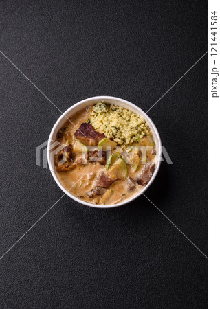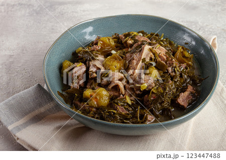 chakapuli, Georgian dish, stewed meat with herbs and tkemali, in white wine, homemade, no people,