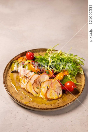 Sliced chicken breast served with grilled vegetables and mustard sauce