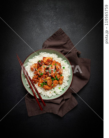 fried chicken teriyaki with rice, green onion and sesame, homemade, no people,