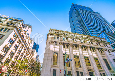 日本の東京都市景観 室町二丁目。三越や江戸桜通り、三井住友信託銀行などを望む