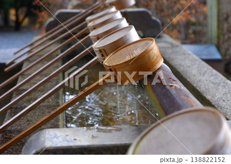 神社の手水舎 柄杓の写るきれいな水