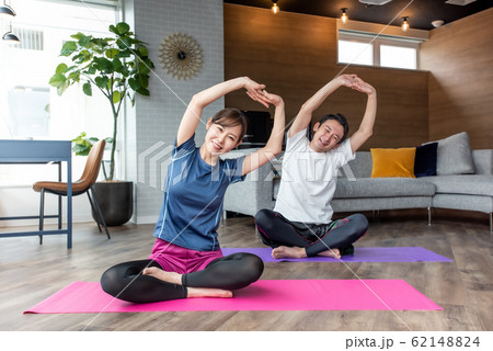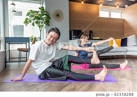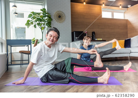 自宅でストレッチ ヨガをする中年女性とそれを見守る旦那さん